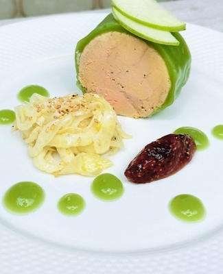 Servir le Foie Gras dans une assiette avec la salade de fenouil et une quenelle de confiture de figues.
